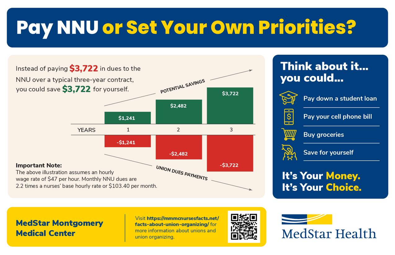 If National Nurses United (NNU) unionize nurse associates at MedStar Montgomery Medical Center you will be required to pay monthly dues to NNU. Dues are deducted from your after-tax take home pay.